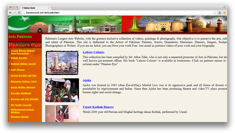 | Description | Pakistani Arts Website, with the greatest exclusive collection of videos, paintings & photographs. Site is dedicated to the Artists of Pakistan: Painters, Actors, Dramatists, Musicians, Dancers, Singers, Sculptors, Photographers or Writers. | |