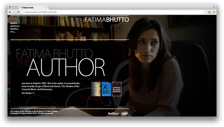 | Description | Fatima Bhutto is the author of three books: Whispers of the Desert and 8.50 a.m. 8 October 2005. Her third book, Songs of Blood and Sword is published around the world in 2010. |
