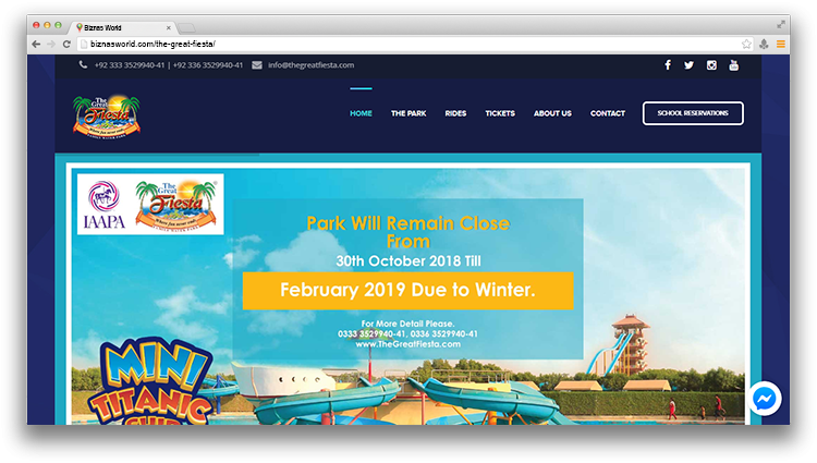 | Description | The Great Fiesta Water Park is a hi-tech and action packed water park, largest Water Park in Karachi, Enjoy world class Family Water Park Facilities at your own city Karachi, thrilling entertainer with amazing features for all ages, your ultimate water sports holiday destination. | |