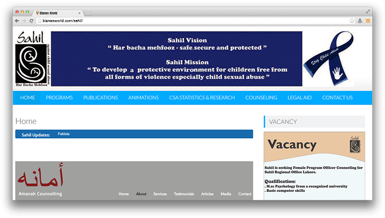 | Description | Sahil is an organization in Pakistan that works exclusively on the issue of child sexual abuse and exploitation. Focus is on research, raising awareness, legal advocacy, intervention training, and crisis intervention. | |