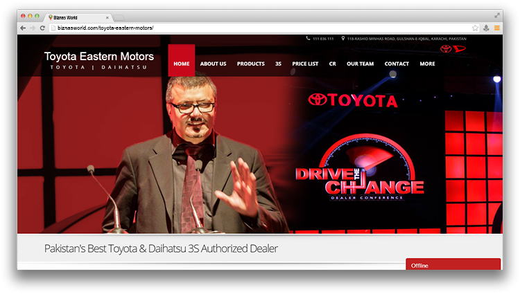 | Description | Toyota Eastern Motors is one of the largest dealer of Indus Motor Company Limited, the whole and sole manufacturer and distributor of Toyota and Daihatsu vehicles in Pakistan. It has been serving the Toyota and Daihatsu customers in Pakistan since 1992. | |