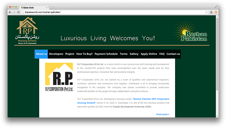 | Description | RP Corporation (Pvt.) Ltd. developer of housing society named Roshan Pakistan or RP Housing Scheme in Sector E-16, Zone II, Islamabad approved by Capital Development Authority (CDA). |