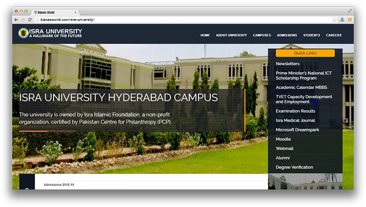 | Description | Offers coursed in Business Administration, Medicine and Computer Science. The university is owned by Isra Islamic Foundation, certified by Pakistan Centre for Philanthropy (PCP). | |
