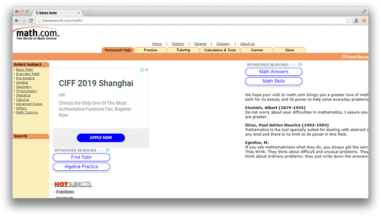 | Description | Free math lessons and math homework help from basic math to algebra, geometry and beyond. Students, teachers, parents, and everyone can find solutions to their math problems instantly. |