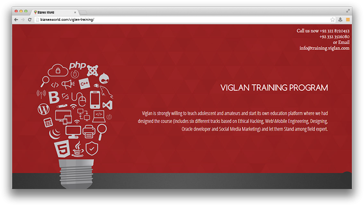 | Description | Viglan Training is an initiative taken by Viglansolutions. Viglan is Strongly willing to teach adolescent and amateurs and start its own education platform where we had designed the course (includes six different tracks based on Ethical Hacking, Web\Mobile Engineering. | |