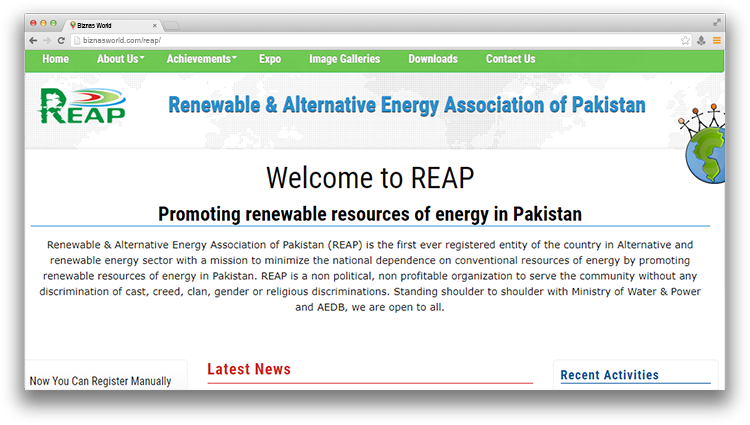 | Description | Renewable & Alternative Energy Association of Pakistan (REAP) is the first ever registered entity of the country in Alternative and renewable energy sector with a mission to minimize the national dependence on conventional resources of energy by promoting renewable resources of energy in Pakistan. |