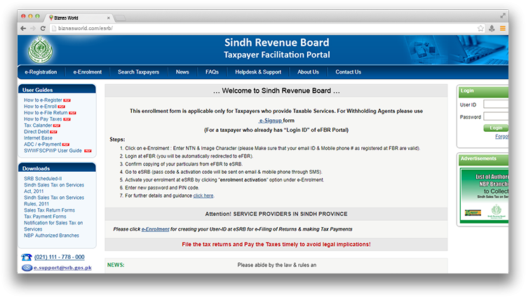 | Description | Pursuant to the 7th NFC award the Government of Sindh (GoS) decided to impose, assess and collect sales tax on services. Accordingly the Sindh Revenue Board Act, 2010 was promulgated on Tuesday, the 24th of June, 2010 vide Gazette Notification No: PAS/Legis-B-12/2010 having duly received the assent of Sindh Assembly. |