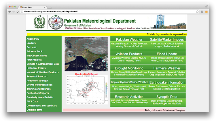 | Description | PMD, scientific and service department, functions under the Ministry of Defence and responsible for providing meteorological service throughout Pakistan. | |