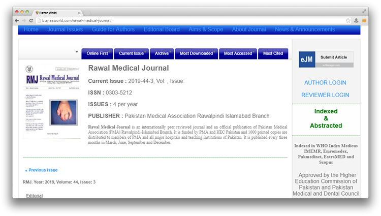 | Description | Rawal Medical Journal is an internationally peer reviewed journal and an official publication of Pakistan Medical Association (PMA) Rawalpindi-Islamabad Branch. It is funded by PMA and HEC Pakistan and 1000 printed copies are distributed to members of PMA. |