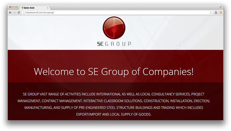 | Description | SE GROUP VAST RANGE OF ACTIVITIES INCLUDE INTERNATIONAL AS WELL AS LOCAL CONSULTANCY SERVICES, PROJECT MANAGEMENT, CONTRACT MANAGEMENT, INTERACTIVE CLASSROOM SOLUTIONS, CONSTRUCTION, INSTALLATION, ERECTION, MANUFACTURING, AND SUPPLY OF PRE-ENGINEERED STEEL STRUCTURE BUILDINGS AND TRADING WHICH INCLUDES EXPORT/IMPORT AND LOCAL SUPPLY OF GOODS. |