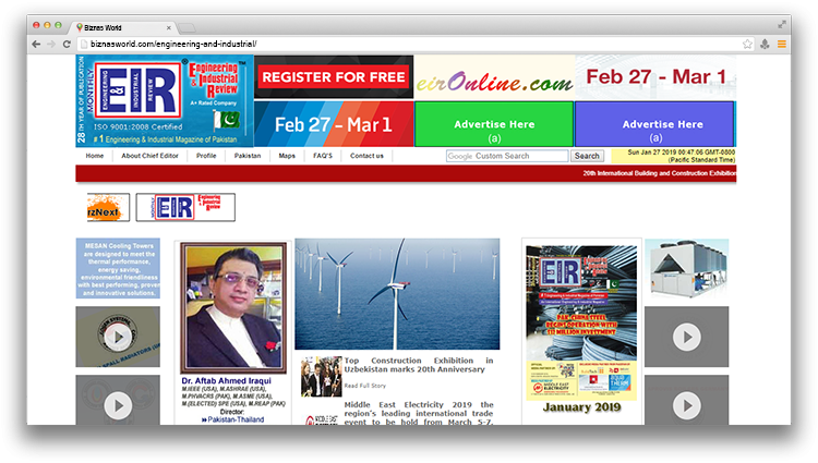 | Description | Engineering & Industrial Review is commonly known as EIR a Monthly Engineering Magazine which is famous as #1 Engineering & Industrial Magazine of Pakistan. The only ISO certified magazine of the world.Engineering & Industrial Review (EIR) is being published since September 1991. | |