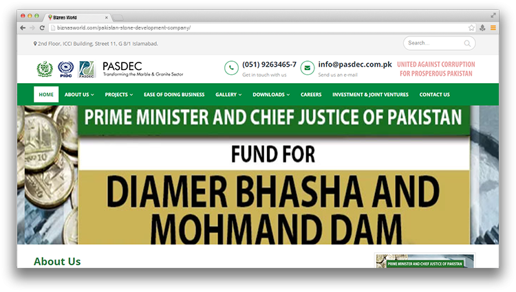 | Description | Pakistan Stone Development Company (PASDEC) is established in 2006 as a not for profit Company under section 42 of the Companies Ordinance 1984. The Company is a subsidiary of Pakistan Industrial Development Corporation(PIDC) working under the auspices of Ministry of Industries. |