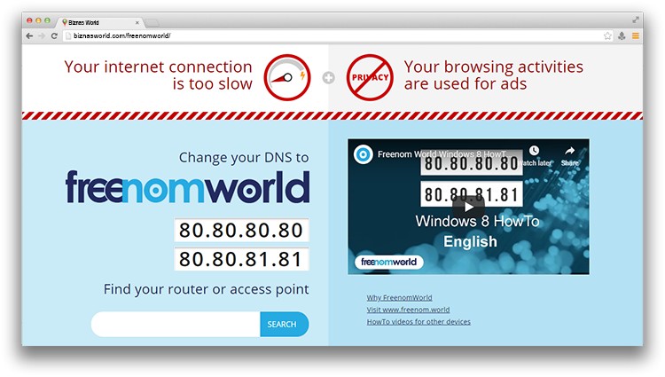 | Description | Change your DNS to Freenomworld. Find your router or access point. | |