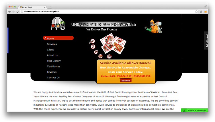 Description We are happy to introduce ourselves as a Professionals in the field of Pest Control Management business of Pakistan. From last Few Years We are the most leading Pest Control Company of Karachi.
