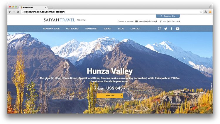 | Description | SAIYAH provides the services of sightseeing, trekking and mountain-climbing for the tours of foreigners, and arranges the domestic and overseas travels for Pakistanis since the establishment in 2007. The company was founded by the staff specialized in tourism and it continued growing. As of in 2019 (In 2019 at present), it has gained the reputation as the most active travel company in Pakistan |